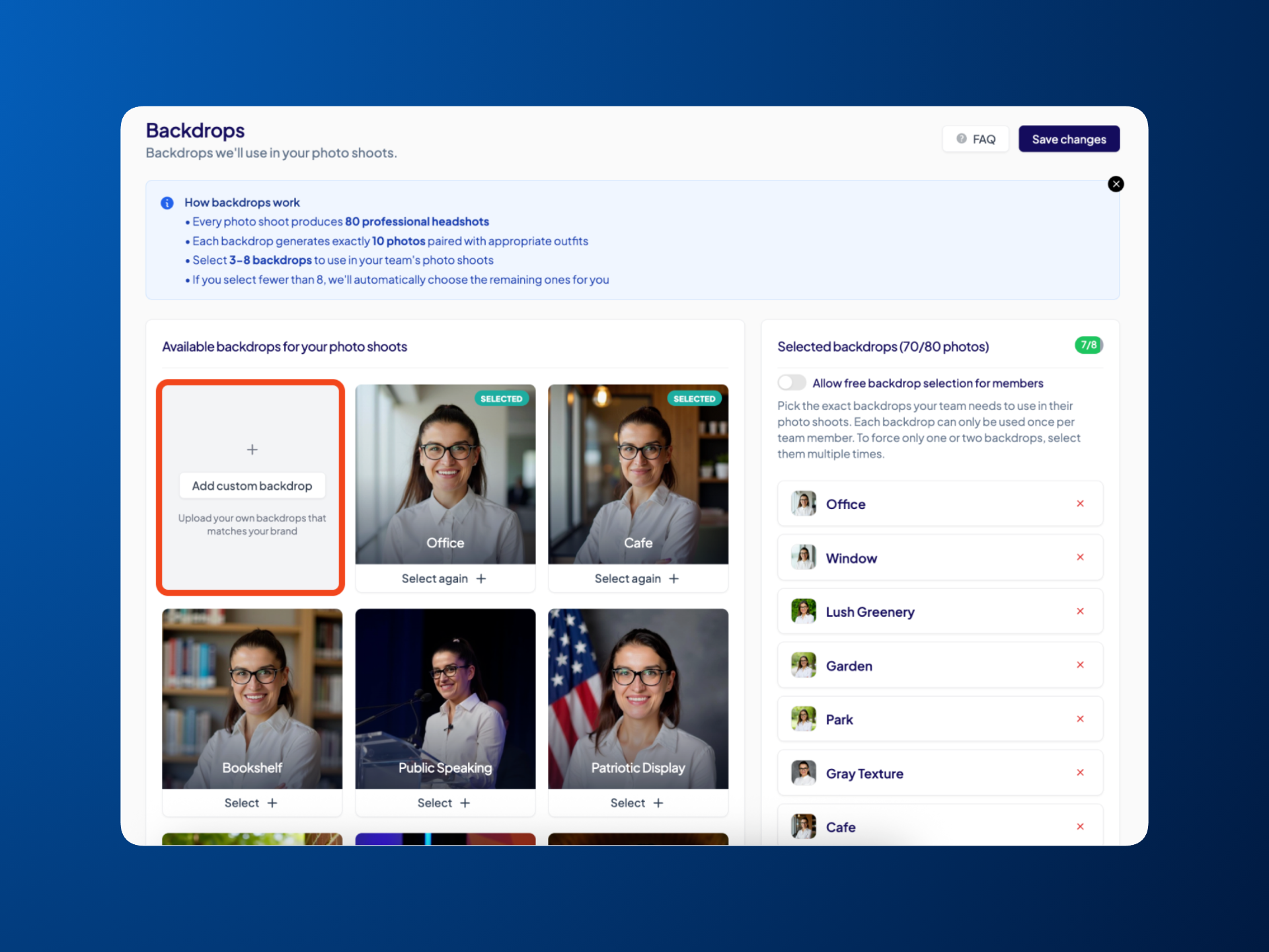 Note: If you want to use fewer than 8 backdrops (for example, a single consistent backdrop), simply select the same backdrop multiple times. This simply means your team will get more photos with that same background.
