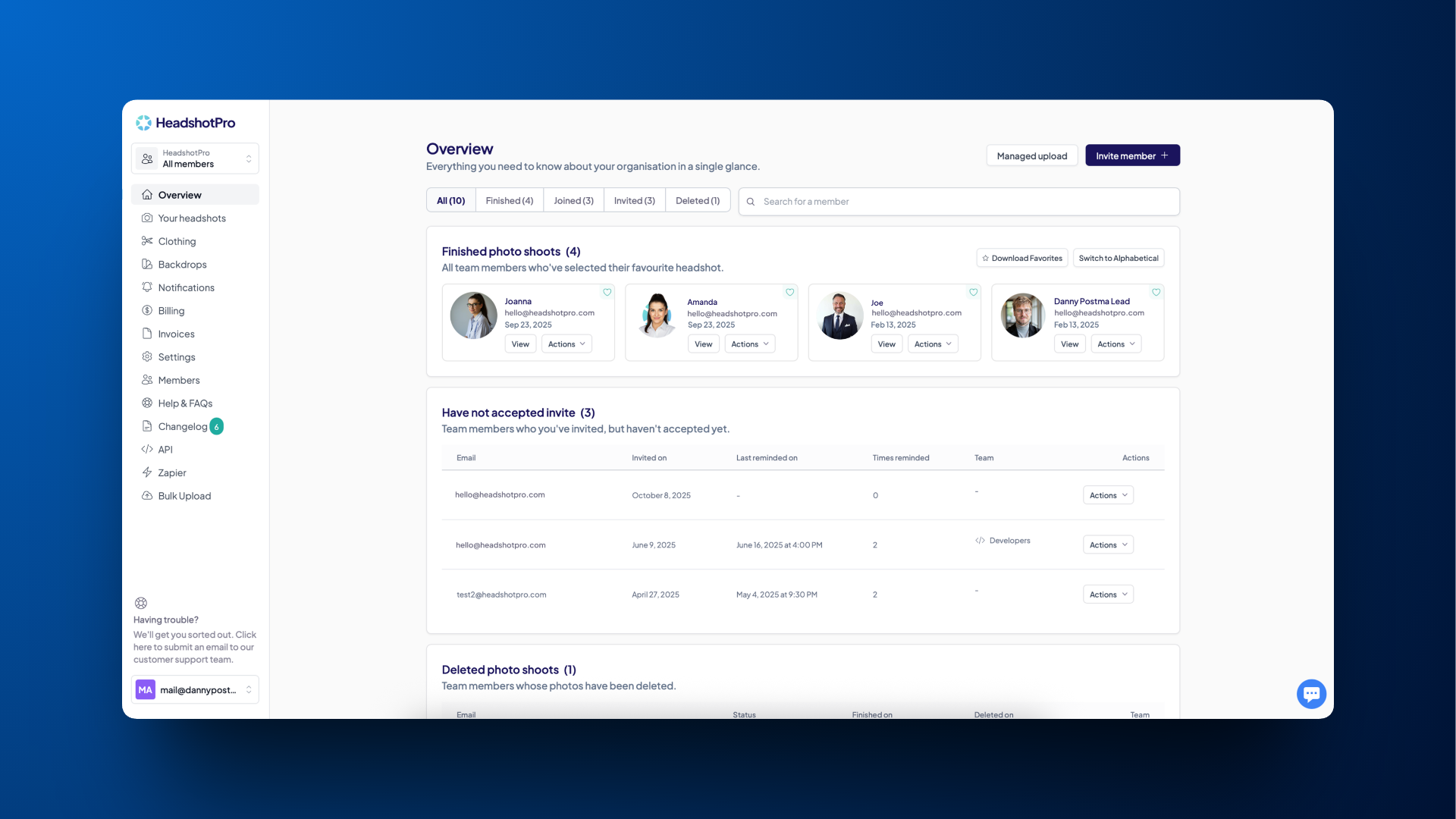 As a team owner or team admin, you can view, manage, and edit all headshots of your organization, including your own, directly from the Overview section of your dashboard: