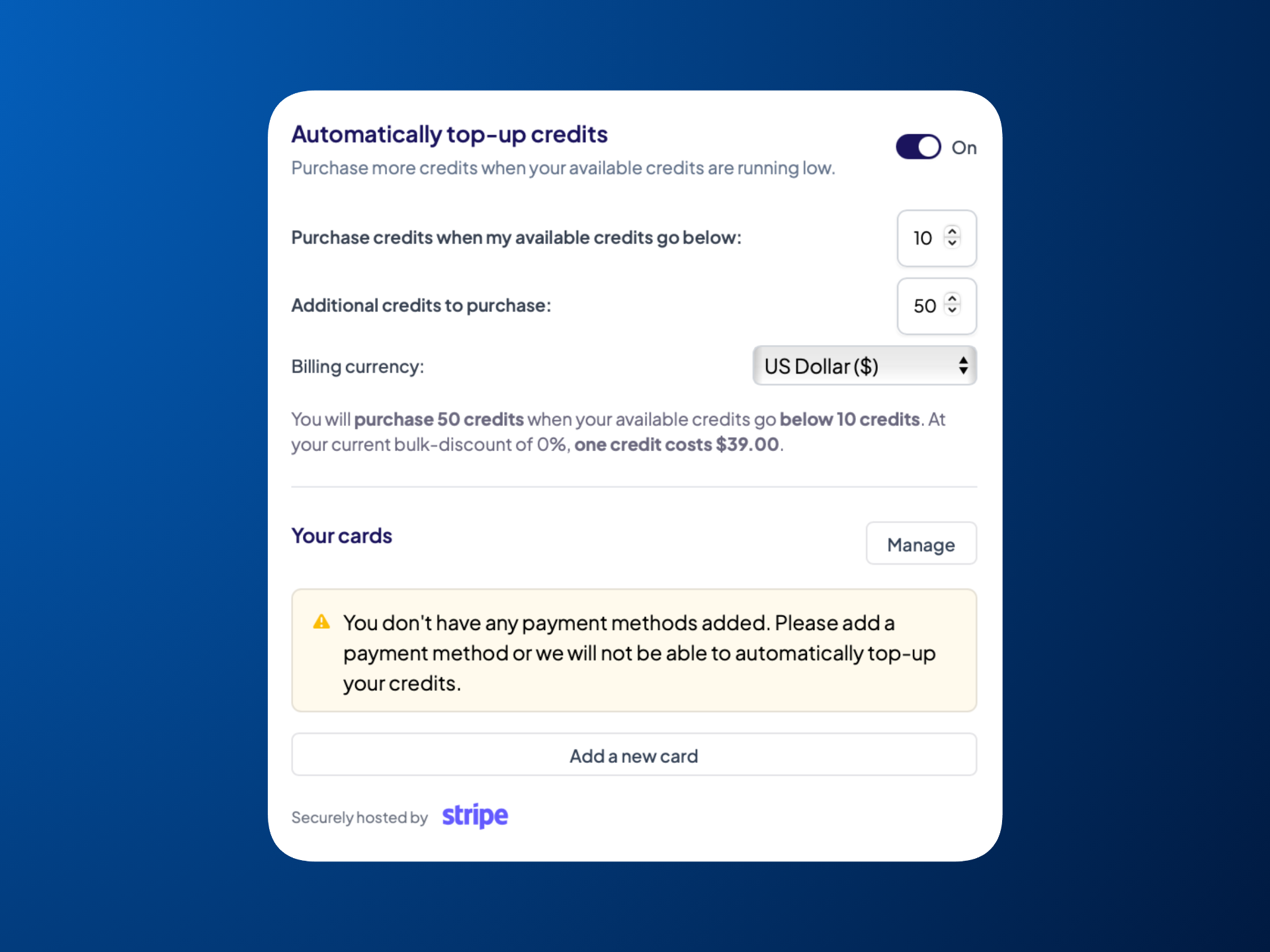 You can choose the threshold that triggers a top-up, set how many credits are added each time, and select your billing currency.